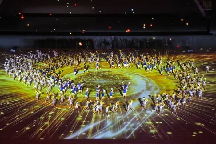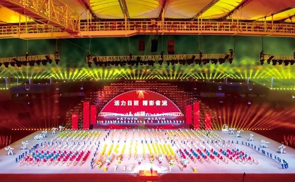当晚的日照奎山体育中心灯光璀璨、气氛热烈,处处洋溢着激情和活力。晚8时,开幕式正式开始。伴随着《我爱你中国》的昂扬旋律,护旗手分别手执国旗、省运会会旗和第二十五届省运会会旗走进体育场。裁判员、运动员代表团依次入场。