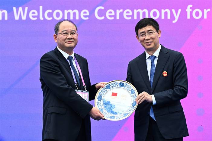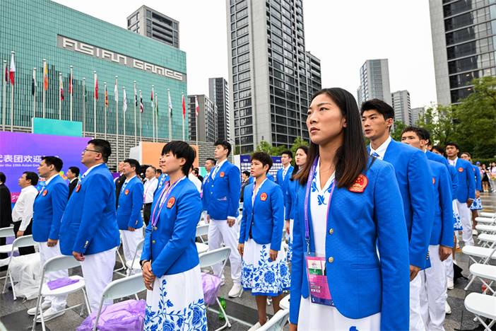 中国体育代表团作为杭州亚运会东道主,组成了1329人的代表团,其中运动员886人(女运动员437人,男运动员449人),将参加除卡巴迪、板球以外的38个大项、407个小项的比赛。中国体育代表团欢迎仪式上升起了鲜艳的五星红旗,奏响了《义勇军进行曲》。现场中国体育代表团、亚运村互赠送了礼物。